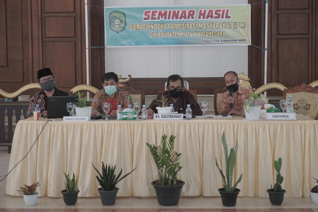 TENGGARONG – Badan Penelitan dan Pengembangan Daerah Kabupaten Kutai Kartanegara menyelenggarakan Seminar Hasil Indeks Partisipasi Masyarakat di Kabupaten Kutai Kartanegara pada hari kamis 03 Desember 2020 yang bertempat di Kedaton Kesultanan Kutai Kartanegara.