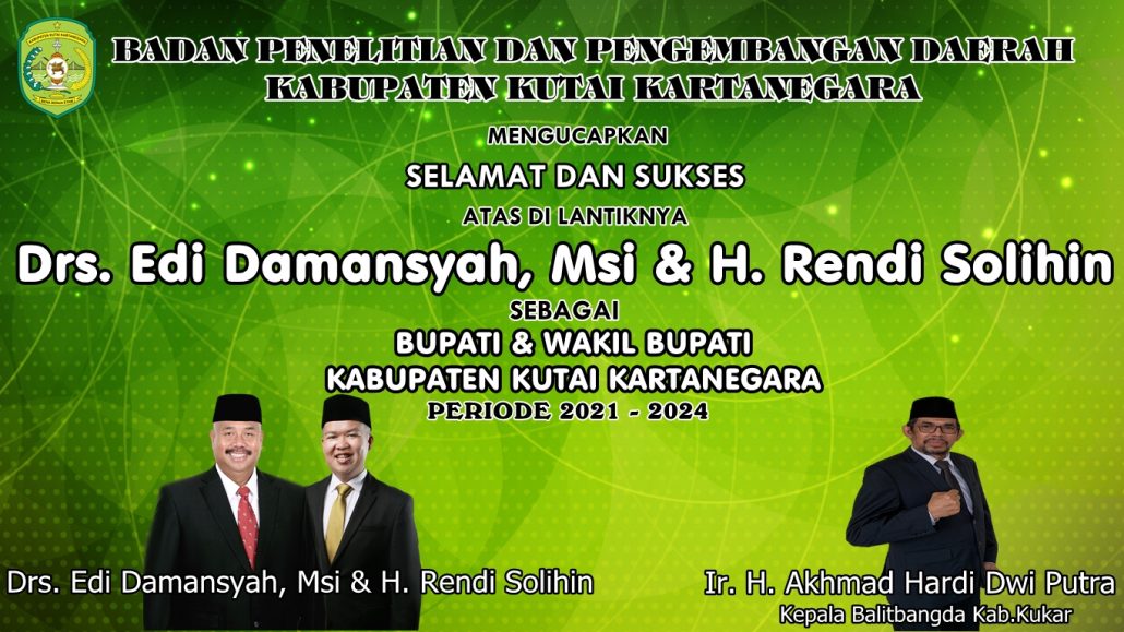 Badan Penelitian dan Pengembangan Daerah Kabupaten Kutai Kartanegara mengucapkan atas pelantiakan Drs. Edi Damansyah dan H. Rendi Solihin sebagai Bupati Kutai Kartanegara dan Wakil Bupati Kutai Kartanegara