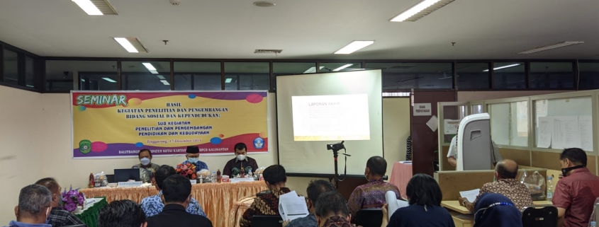 Tenggarong – Badan Penelitian dan Pengembangan Daerah Kabupaten Kutai Kartanegara mengadakan seminar hasil “Kegiatan Penelitian dan Pengembangan Bidang Sosial dan Kependudukan”, sub Kegiatan Penelitian dan Pengembangan Pendidikan dan Kebudayaan, pada tanggal 17 Desember 2021.