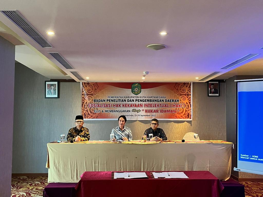 Badan Penelitian dan Pengembangan Daerah Kabupaten Kutai Kartanegara mengadakan Kegiatan Sosialisasi Hak Kekayaan Intelektual dilaksanakan pada hari ini, Jum’at, tanggal 23 September 2022 bertempat di Hotel Selyca Mulya Samarinda. Kegiatan Sosialisasi Hak Kekayaan Intelektual merupakan upaya untuk mewujudkan Visi dan Misi Kepala Daerah yaitu IDAMAN atau INOVATIF, DAYA SAING dan MANDIRI melalui peningkatan kemampuan serta pengetahuan aparatur sipil negara khususnya bagi Para peneliti dan hadirin sekalian pada umumnya terkait dengan pemahaman dan tata cara pendaftaran HAKI.