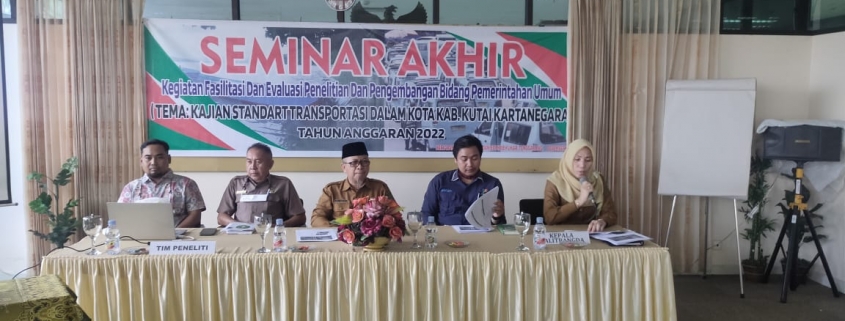 Badan Penelitian dan Pengembangan Daerah (Balitbangda) Kabupaten Kutai Kartanegara mengadakan Seminar Akhir Kegiatan Fasilitasi dan Evaluasi Penelitian dan Pengembangan Bidang Pemerintahan Umum dengan Tema ” Kajian Standart Transportasi Dalam Kota Kab. Kutai Kartanegara ” Tahun Anggaran 2022, pada hari Selasa 06 Desember 2022 di Kantor Balitbangda Gedung Bappeda Lt.4 Komplek Kantor Bupati, Tenggarong.