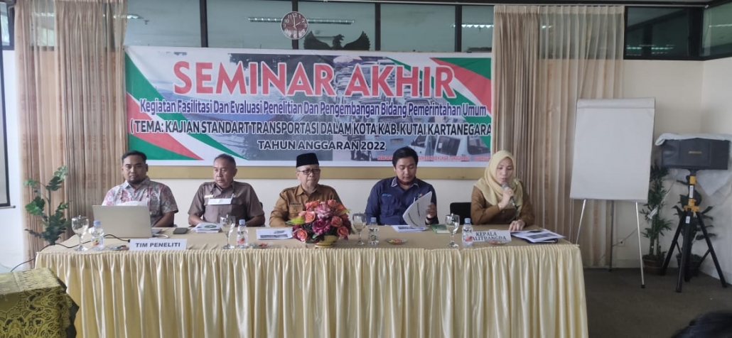 Badan Penelitian dan Pengembangan Daerah (Balitbangda) Kabupaten Kutai Kartanegara mengadakan Seminar Akhir Kegiatan Fasilitasi dan Evaluasi Penelitian dan Pengembangan Bidang Pemerintahan Umum dengan Tema ” Kajian Standart Transportasi Dalam Kota Kab. Kutai Kartanegara ” Tahun Anggaran 2022, pada hari Selasa 06 Desember 2022 di Kantor Balitbangda Gedung Bappeda Lt.4 Komplek Kantor Bupati, Tenggarong.